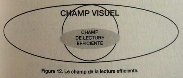 Notre champ de lecture efficiente est une sous partie de notre champ visuel. Sur une page, nos yeux se fixent sur un point et il y a une zone ovale où l’on arrive à bien lire. Si nos yeux se fixent sur un mot en particulier, on déchiffre aussi les mots autour.