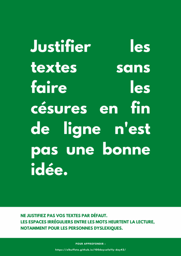 Ne justifiez pas vos textes par défaut. Les espaces irréguliers entre les mots heurtent la lecture, notamment pour les personnes dyslexiques.
